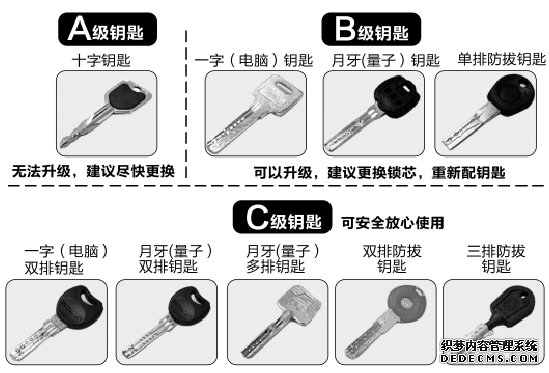 近日一組看鑰匙識鎖的圖片在網(wǎng)上瘋傳,開鎖公司專家開鎖達(dá)人為你詳解 家里的防盜門真的能防盜么?上面一張圖,教大家通過鑰匙來識別鎖的安全級別。打頭第一張,赫然就是目前還