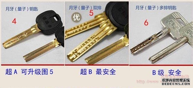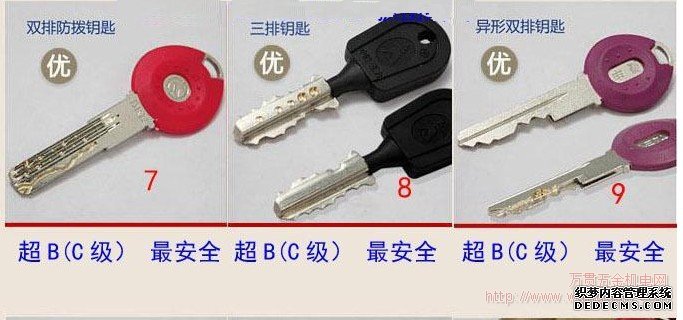 辨別 防盜鎖 級(jí)別最好的方法就是用鑰匙辨別,一看鑰匙就能輕松了解防盜鎖的級(jí)別!詳細(xì)請(qǐng)看下圖 從圖上我們可以看出,鑰匙越復(fù)雜,防盜鎖的級(jí)別越高,也就越安全。判斷換鎖芯的
