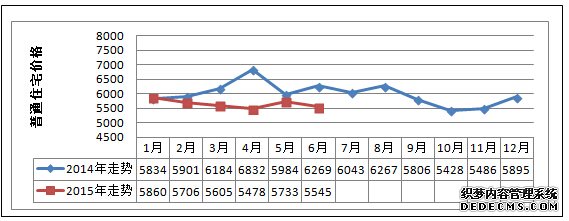 2015年1-6月城市區(qū)新建商品住房成交面積折線圖 3.商品房待售情況。截至6月末,全市城市區(qū)已批準上市商品房待售面積為364.82萬平方米,環(huán)比下降13.85%。其中商品住宅待售面積為301.63萬平方米,環(huán)比下降16.17%。 4.商品房成交價格變動情況。1-6月,城市區(qū)商品房平均價格6058.82元/平方米,同比下降9.75%。其中商品住房5639.28元/平方米,同比下降8.74%。 6月,城市區(qū)商品房平均價格5797.39元/平方米,同比下降14.10%,環(huán)比下降7.05%。其中商品住房5545.26元/平方米,同比下降11.54%,環(huán)比下降3.27%。
