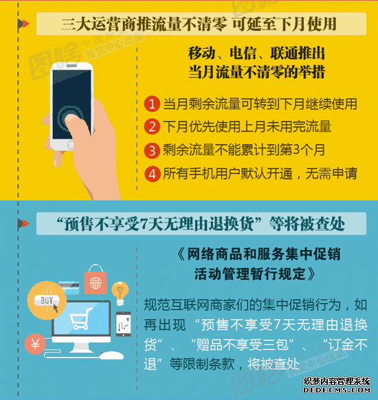 10月1日起,這些新規(guī)正式實(shí)施。三大運(yùn)營(yíng)商正式推出“當(dāng)月流量不清零”;新食品安全法實(shí)施,買到不符合安全標(biāo)準(zhǔn)食品最低可索賠千元;雙11等電商促銷,不得限定退貨條件......還有哪些新規(guī)將影響你我生活?