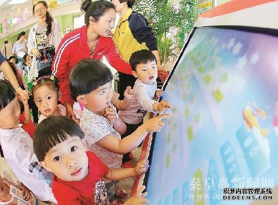5月26日,在秦皇島海港區(qū)東方明珠禮儀幼兒園,小朋友們?cè)诶蠋煹闹笇?dǎo)下操作“少兒觸摸閱讀機(jī)”。當(dāng)日,東方明珠城第一社區(qū)和區(qū)圖書館的工作人員帶著電子閱讀器、節(jié)日禮物來(lái)到轄區(qū)幼兒園,提前為小朋友們慶祝“六一”兒童節(jié)。
