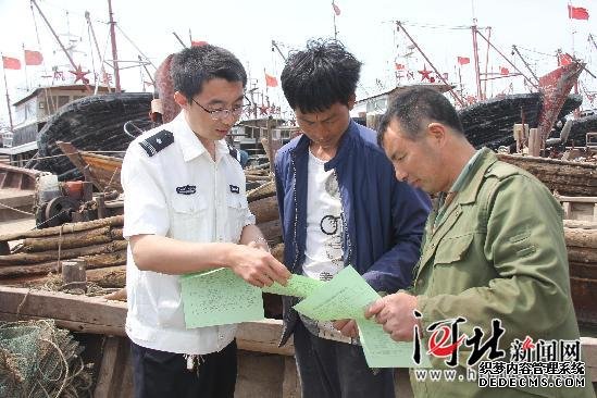 6月1日12時(shí)起黃渤海海域?qū)⑷孢M(jìn)入伏季休漁期。為提前做好休漁期工作,秦皇島昌黎縣漁政部門(mén)工作人員通過(guò)發(fā)放傳單、張貼布告等方式提前宣傳休漁法規(guī),并協(xié)助已進(jìn)港的漁民清理船上漁具,確保6月1日12時(shí)前全縣300余艘捕撈船全部進(jìn)港休漁。圖為工作人員向船主宣傳休漁期法規(guī)。