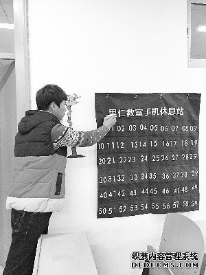 當(dāng)天上午,記者來到里仁學(xué)院,在教學(xué)樓C區(qū)、D區(qū)的教室里,記者看到門內(nèi)左側(cè)墻壁上都有一個(gè)藍(lán)色的布袋,袋子上方寫著“里仁教室手機(jī)休息站”,下面則是編號為0到59的60個(gè)小袋。