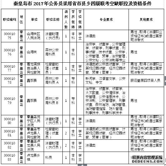 為滿足工作需要,秦皇島市將對2017年公務(wù)員錄用省市縣鄉(xiāng)四級聯(lián)考空缺的招錄職位進(jìn)行公開調(diào)劑補(bǔ)錄,共涉及11個(gè)職位。調(diào)劑補(bǔ)錄采用網(wǎng)上報(bào)名的方式,報(bào)名時(shí)間為2017年8月15日9:00至