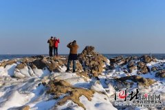 近期的一場降雪,將布滿礁石的北戴河海灘裝扮成冰雪世界。遼闊的海面、嶙峋的礁石以及飛掠而過的海鷗,吸引了不少市民前來賞雪景。圖為游人站在礁石上拍照留影。...