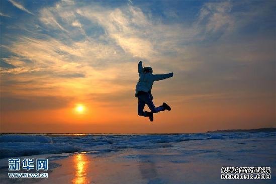 這是秦皇島市海港區(qū)海邊的冰海日出景色(1月3日攝)。進(jìn)入冬季,河北省秦皇島沿海岸線出現(xiàn)結(jié)冰現(xiàn)象,呈現(xiàn)出冰海奇觀的風(fēng)景。 一名游人在秦皇島市海港區(qū)結(jié)冰的海邊躍起拍照(